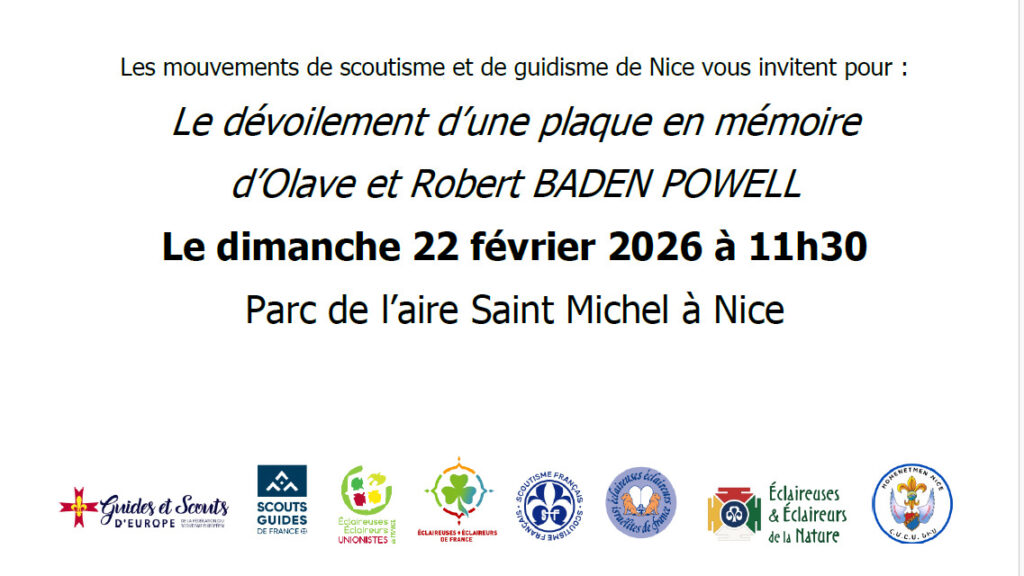 La cérémonie de dévoilement de la plaque commémorative dédiée à Olave et Robert Baden-Powell se déroulera donc à cette occasion en présence de Madame Ouaknine qui représentera le Maire de Nice et des différents mouvements scouts présents.